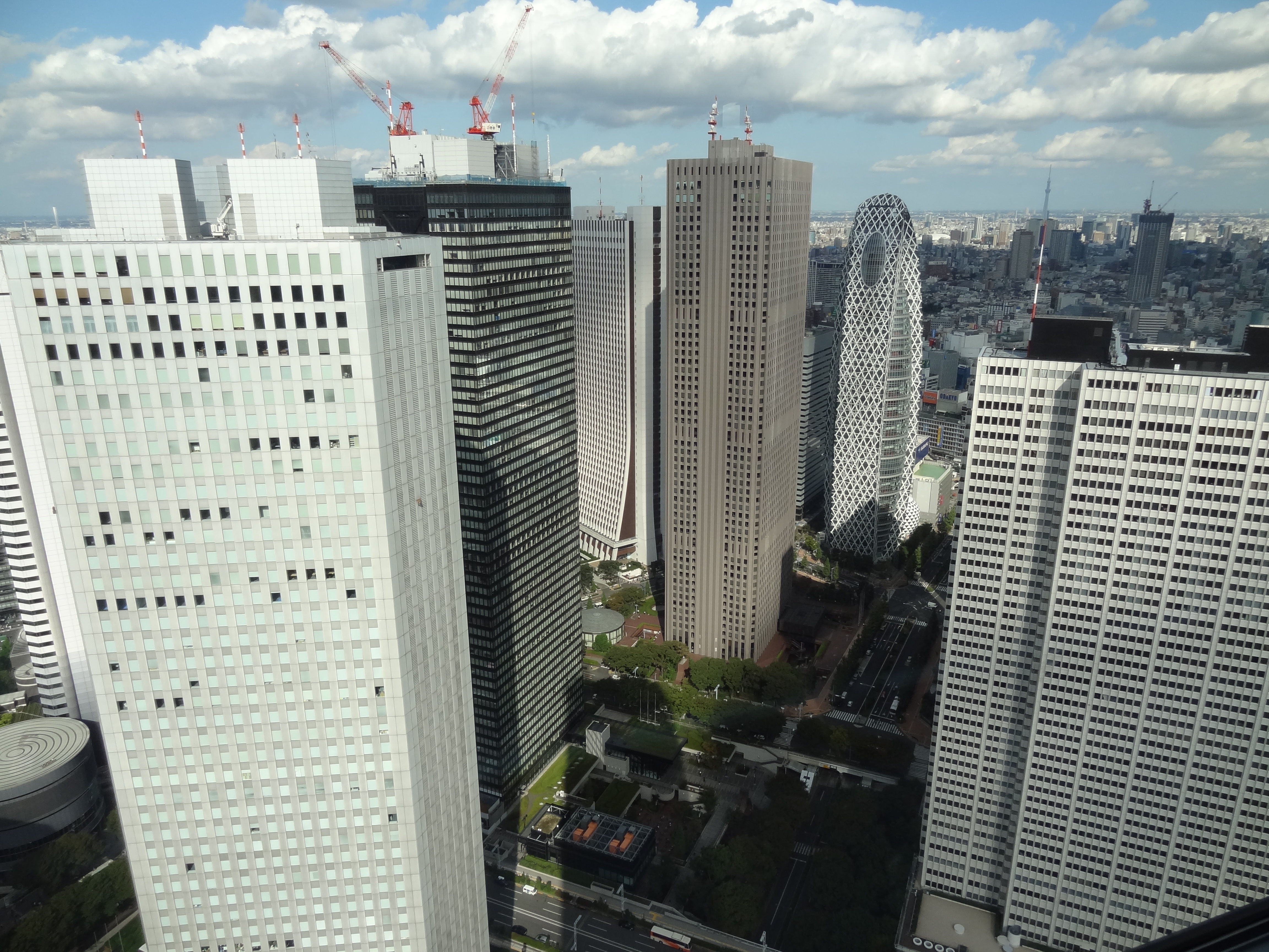 The sun is still out and its a pleasant 24 degrees around Tokyo city today. We venture into the city again to one of Tokyo’s landmarks, the Tokyo Metropolitan Government building. Its double towers and complex of buildings on the ground make it a formidable structure. The main reason for coming here is to visit an observatory at the top of its towers. Normally you can choose between the northern and southern towers but today the southern tower is closed to visitors. This is a popular thing for tourists to do because its free. There are taller structures around, particularly the new Tokyo Skytree Town, but you pay for the privilege. The northern tower is busy with visitors today but the wait isn’t too long. The lift takes you up to the 45th floor and from there you get some great views of Tokyo and how densely organised it is. Remember it is ‘the most populous metropolitan area in the world’. There is some adventurous architecture around but generally the sky scrapers are of fairly conventional design. The view helps to put our city travels at ground level in perspective. From here we plan to visit the Shinjuku Gyoen National Garden but it is closed because of a dengue breakout. Apparently over 200 people in Tokyo have come down with the disease. I know how much such a problem can be for a city as Cairns has experience.