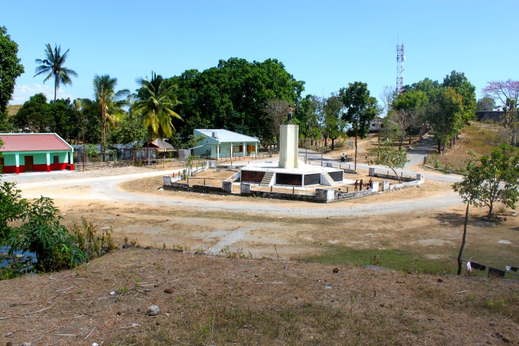 I hire a car and make for Balibo, the village where the five journalists from Australia TV were murdered by the Indonesian Army in 1975. Balibo is a small village up in the hills not far from the coast. I have heard all sorts of stories about how long it will take me to get there so I’m anxious to get on the road as soon as possible. Car hire paperwork is painfully slow. The road follows the coast west from Dili and is bitumen, but badly maintained. There are huge potholes everywhere and the road edges drop off severely. Passing through one village I slow behind a truck and while not watching the road I drop the front passenger wheel into a deep pothole. I lose traction. Two wheels are swinging in the breeze and I’m stuck. Embarrassingly I’m surrounded by school children who find my predicament hilarious, peels of laughter everywhere! I get out and we all analyse the situation. The conclusion is to get a push and they happily oblige. Timor kids can push and I’m on my way again. Each of the main villages have schools to primary level and some go to mid-school. For high school the have to go to Dili I think. And each village has a different colored uniform. White shorts/skirts with bright green tops, or brown bottoms with white or bright yellow tops. One village had their kids wearing brown bottoms with hot pink tops! I can’t imagine what psychological effects this will have on the boys later in life but it certainly makes them very visible on the road. (I have since heard that the school uniforms can depend on the best deal the school can get on clothing material. Hot pink must have been on special.)